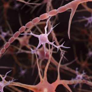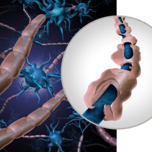 ‘Bij MS kan dat verschillende oorzaken hebben. Het kan een virus zijn of een auto-immuunreactie, een aanval op lichaamseigen cellen. De afweer in onze hersenen is continu alert om schade en indringers op te ruimen, maar bij MS loopt dat uit de hand. De T- en B-cellen, immuuncellen in het brein, sporen microgliacellen aan om de lichaamseigen myeline af te breken. Myeline is de vettige laag rond zenuwuitlopers die ervoor zorgt dat de informatie tussen zenuwcellen snel wordt doorgestuurd. Door die demyelinisatie ontstaan er in de hersenen de voor MS kenmerkende laesies.’