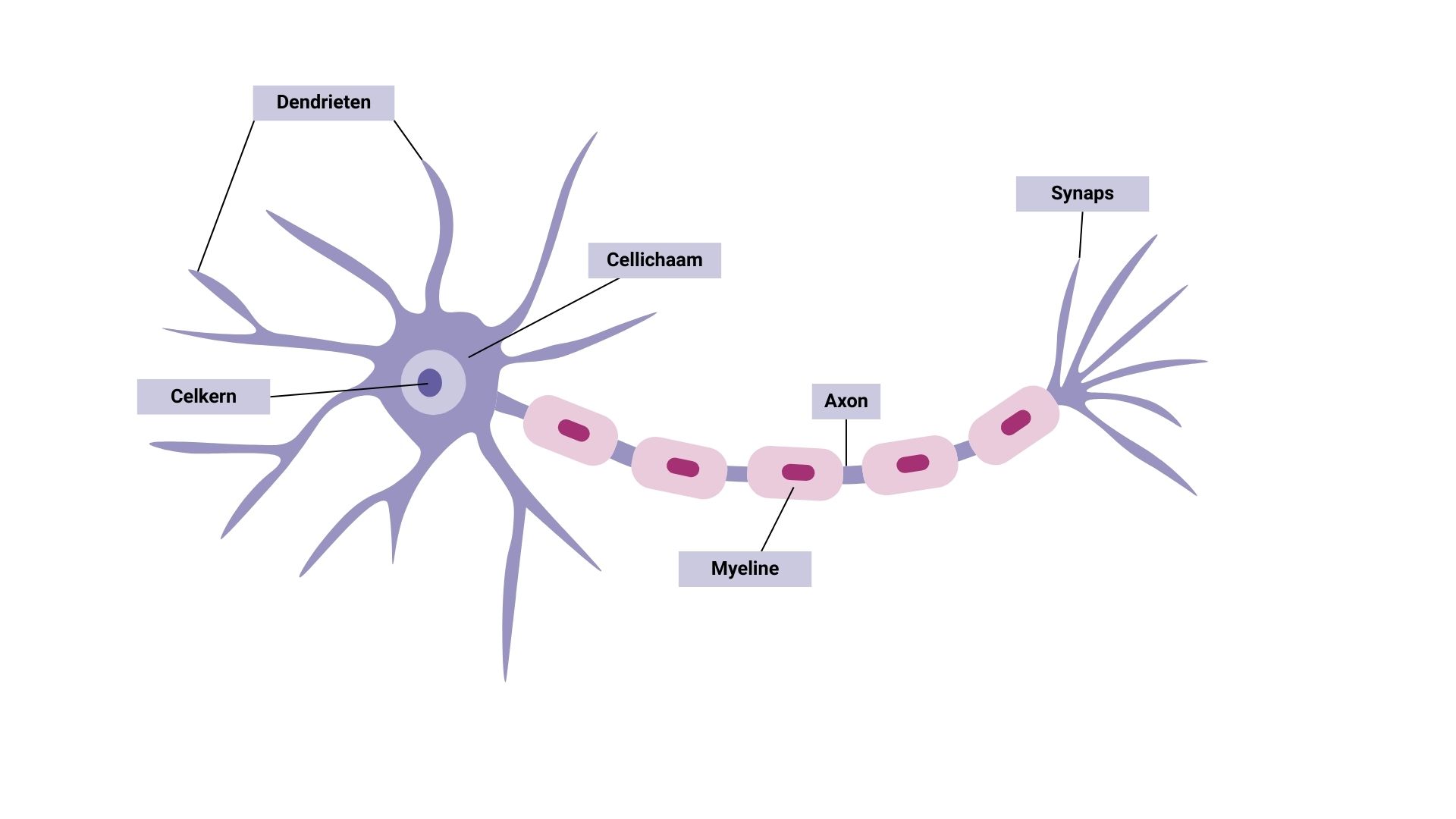 Elke zenuwcel bestaat uit een cellichaam, dendrieten en een axon (zenuwvezels). Het cellichaam bevat een stroperige vloeistof (het cytoplasma), en de celkern. De axon is een uitloper van het cellichaam die vaak onderweg nog vertakt en eindigt bij de zenuwuiteinden. Dendrieten zijn uitlopers van het cellichaam die boodschappen van andere zenuwcellen ontvangen. De contactpunten waar de ene zenuwcel met de andere communiceert zijn de synapsen.